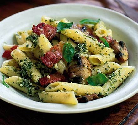 Our creation of bacon & pesto stir-fried pasta looked something like this, though ours was made with onions, peppers, chicken, and parmesan cheese.