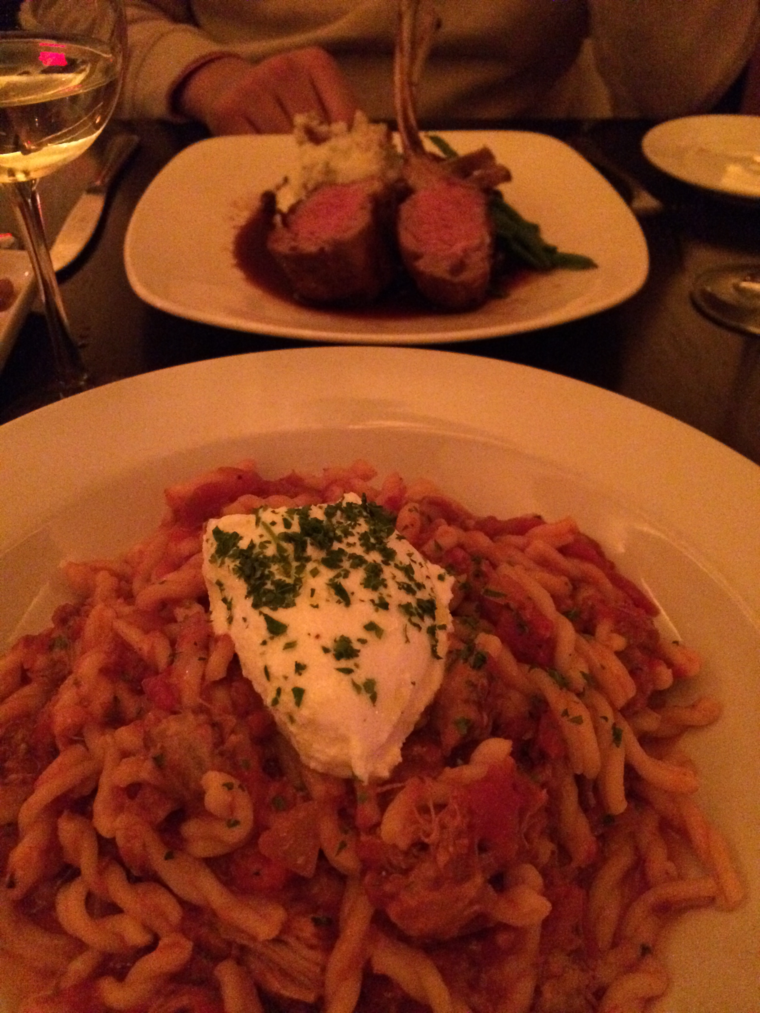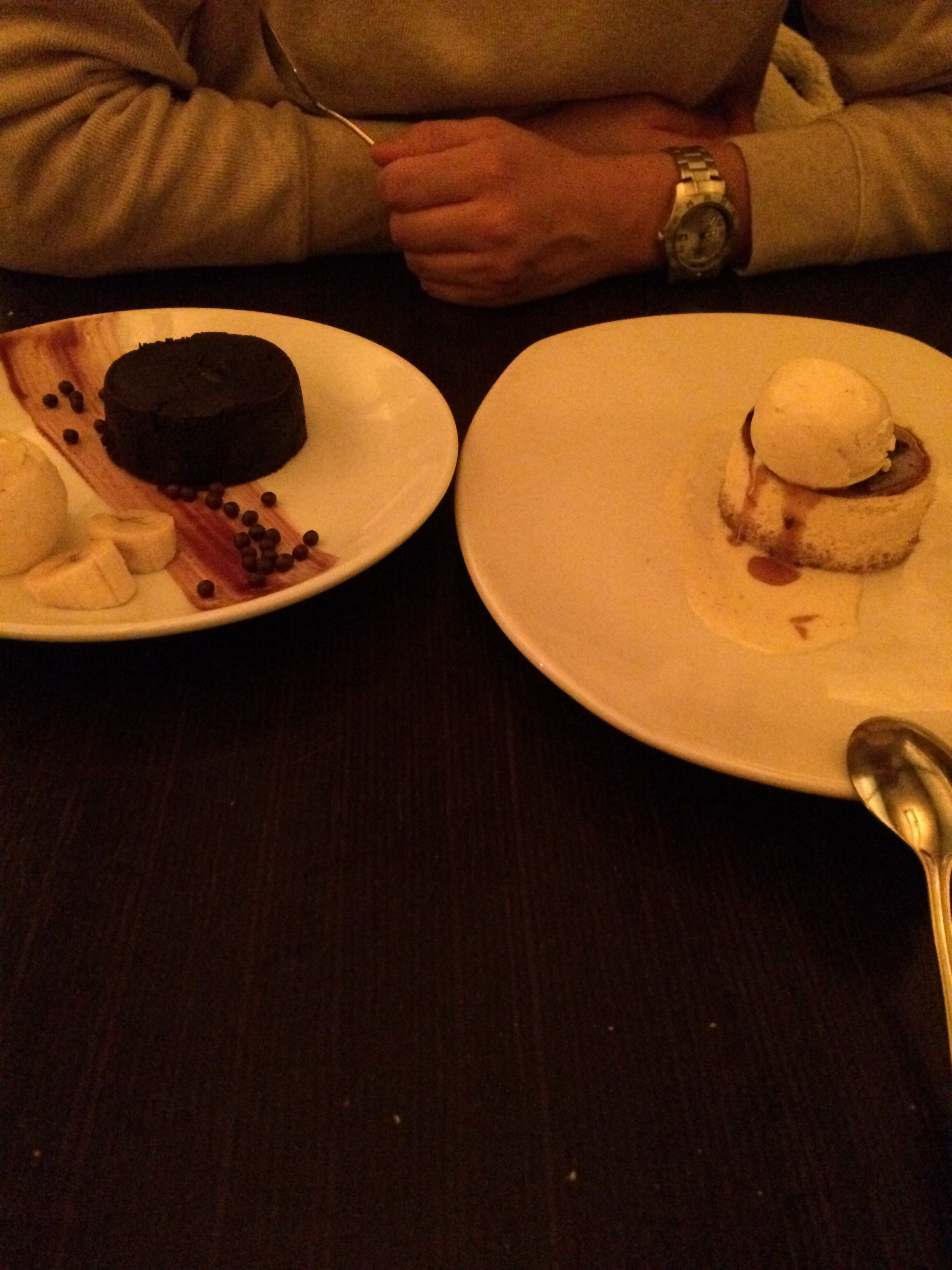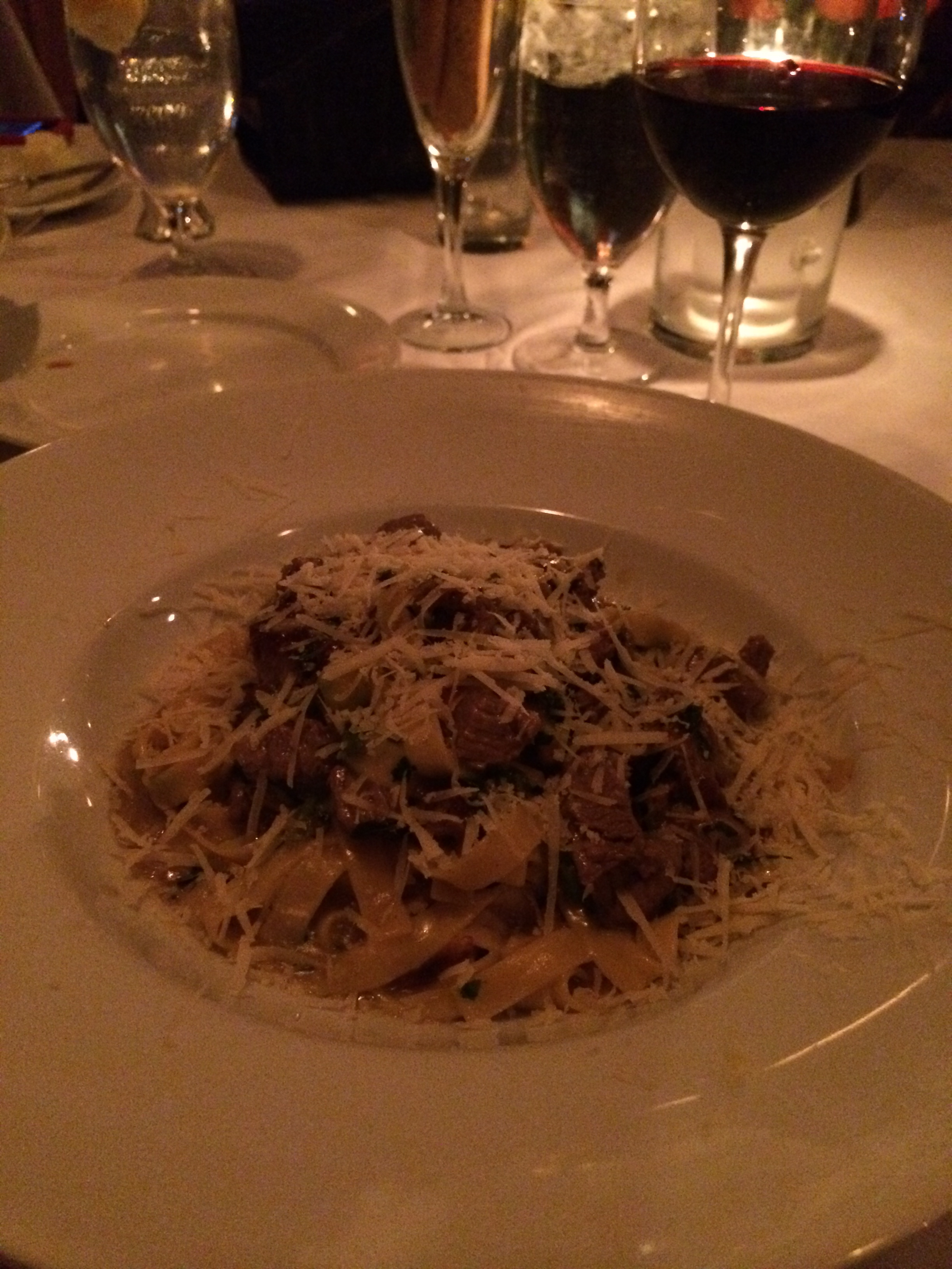 Under recommendation from Jake’s mother, we started with the carpaccio appetizer – finely sliced, delicately seasoned, and drizzled with dressed greens and oil. We ate it too fast for me to remember to take a photo, obviously. We then split two entrees, both specials: a house-made fusilli pasta with bolognese sauce and ricotta cheese, and lamb with pureed garlic mashed potatoes and green beans. I’m a pasta buff, so I preferred the former dish, but both were truly delicious. The entire meal was paired with Little Black Dress Moscato for me, and Josh Cellars Cabernet for Jake. We finished with two desserts: their famous warm nutella cake and seasonal eggnog cheesecake with rum raisin sauce. I swore I was so full that I’d never eat again. My only and very minor complaint is that we were seated in the middle of the dining room, at a small, two-person table, so that all the other tables were surrounding ours and it felt like everyone was looking at us. Not the case, of course, but still. Would’ve preferred something more secluded for a romantic date.